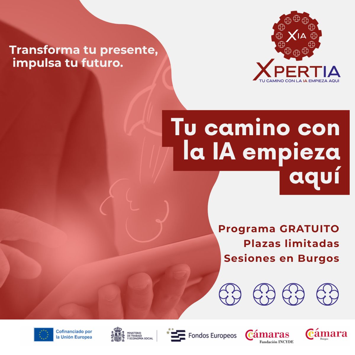 Programa único en Burgos que no se queda sólo en la teoría. Ponemos en marcha, XpertIA, una formación intensiva en Inteligencia Artificial, diseñado con dos itinerarios: uno dirigido a desempleados, y otro dirigido a empresas, trabajadores y autónomos, para ahorrar tiempo, mejorar procesos y ser más competitivos.